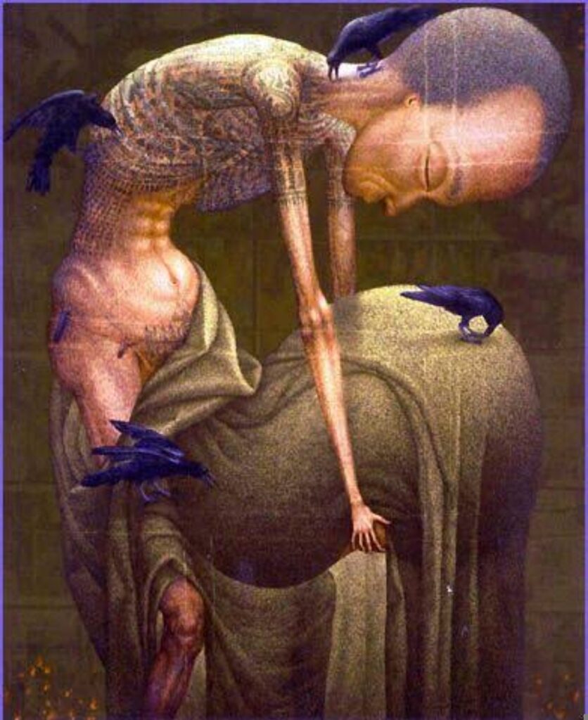 - เปรตตนหนึ่งเป็นก้อนเนื้อ ถูกแร้งกานกตะกรุมรุมเจาะจิก ลอยร้องครวญครางไปในอากาศ เพราะเศษกรรมที่ฆ่านก ในพระนครนั้น